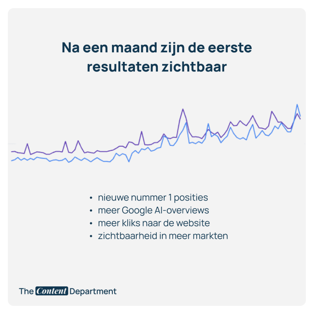 Voordat we nieuwe content toevoegden, hebben we de basis van de website geoptimaliseerd in drie talen. Dit noemen wij onze ‘Content APK’. Hierin kijken we naar een aantal technische elementen, zoals websitestructuur, backlinkingprofiel, structured data, maar optimaliseren we ook de huidige teksten en maken we deze SEO-proof. Met als doel: de website een autoriteit maken in de industrie.
